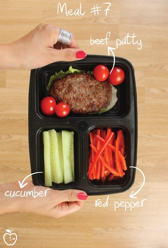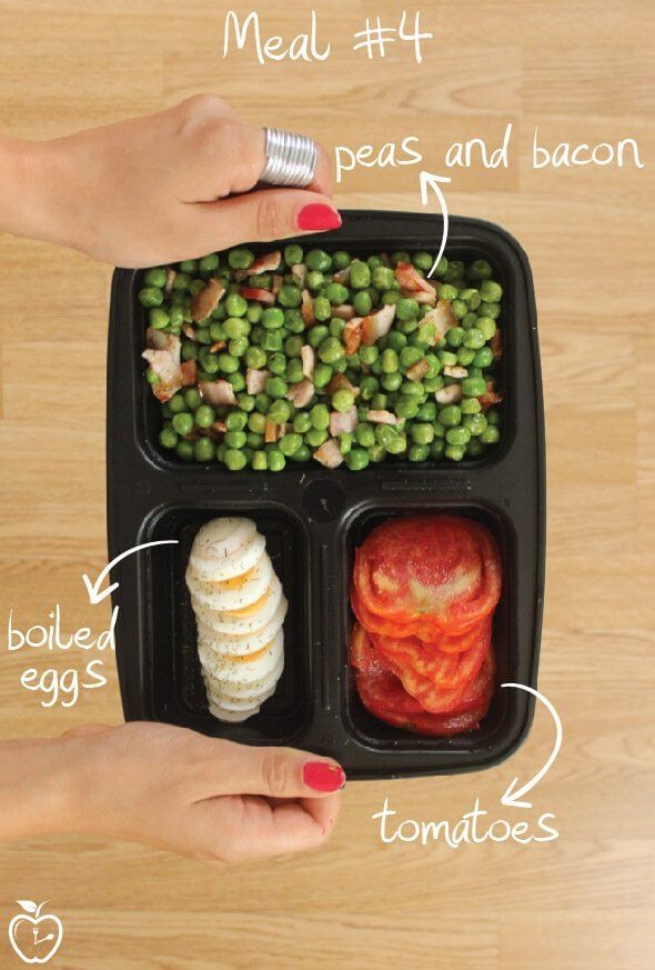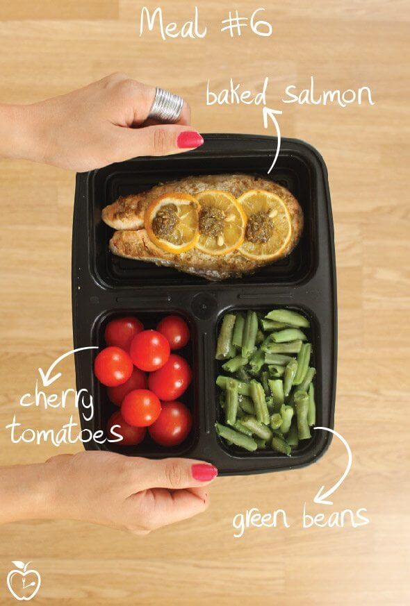 Đặt đậu đã luộc chín vào hộp thức ăn cùng cá hồi và cà chua bi.