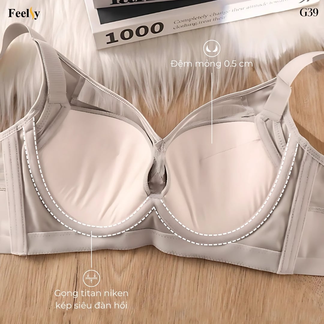 Đệm mỏng chỉ 0.5cm, mềm mại, thoáng khí, thấm hút mồ hôi tốt và tránh hầm bí, mang đến cảm giác nhẹ nhàng nhưng vẫn nâng đỡ tự nhiên, tạo hiệu ứng vòng một đầy đặn như thật. Gọng titan niken kép siêu đàn hồi được tích hợp công nghệ nâng 3D, giúp cố định dáng ngực, khắc phục tình trạng chảy xệ, bè ngang và bền gấp 2–3 lần so với gọng thường.