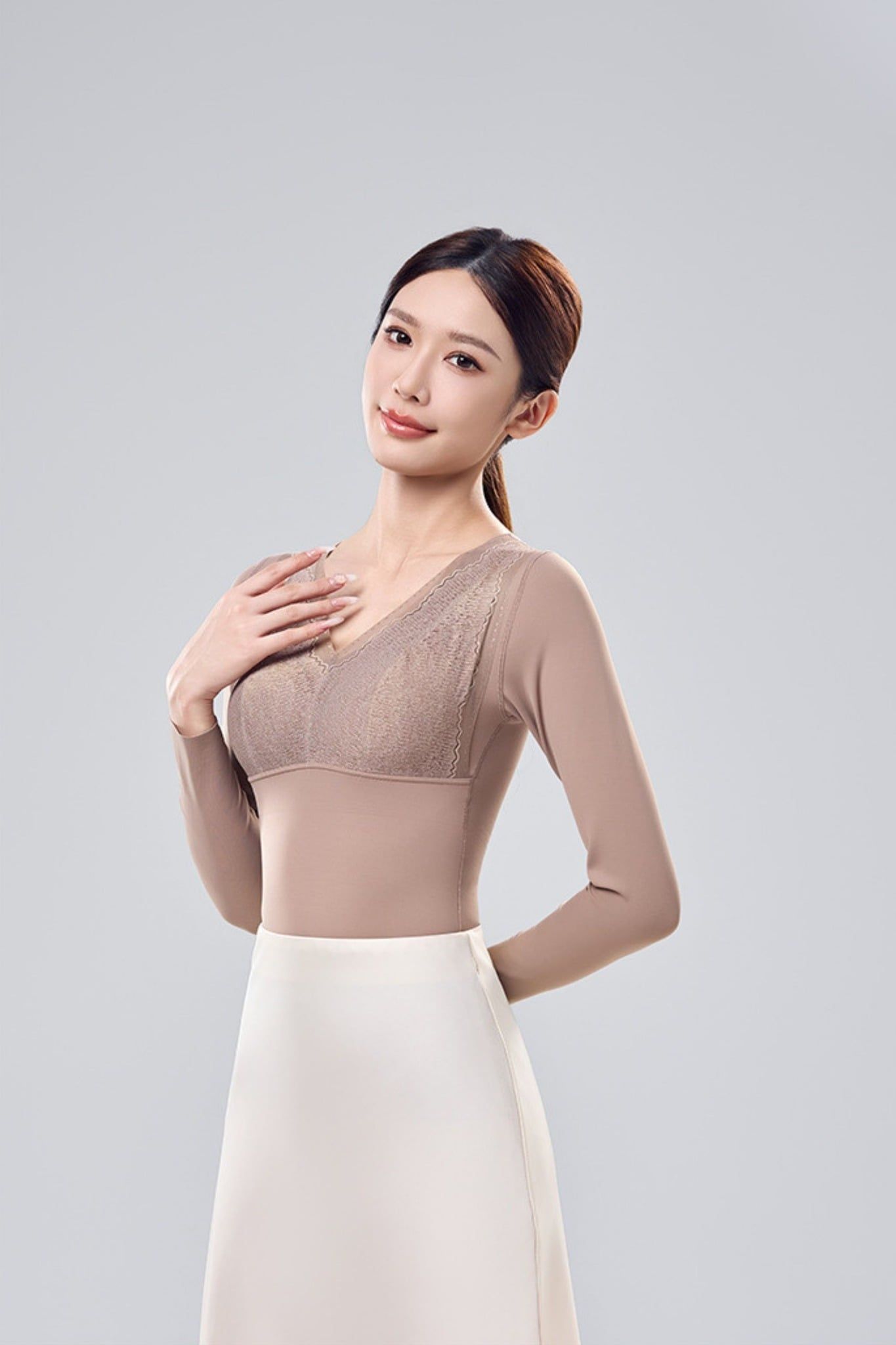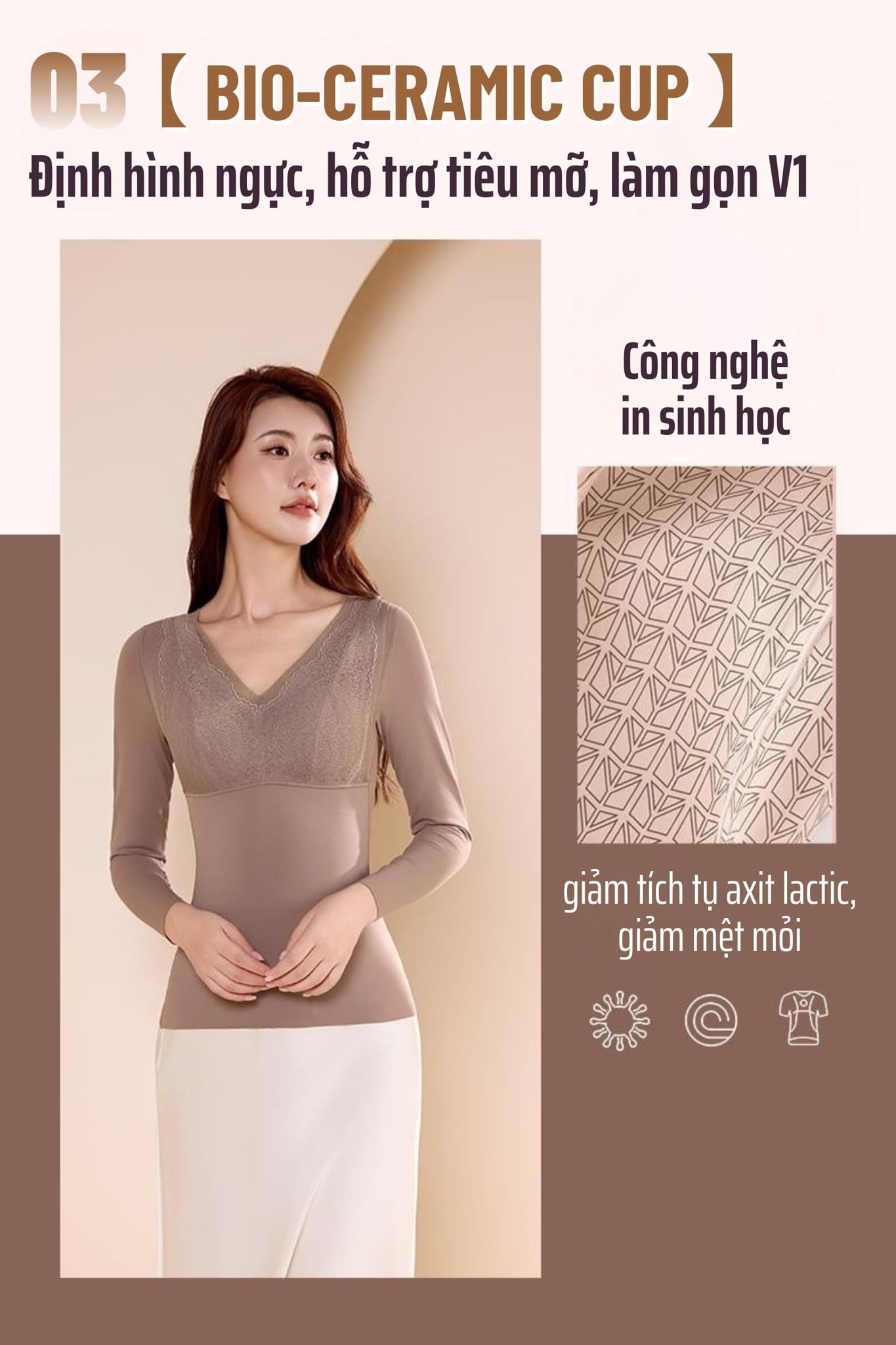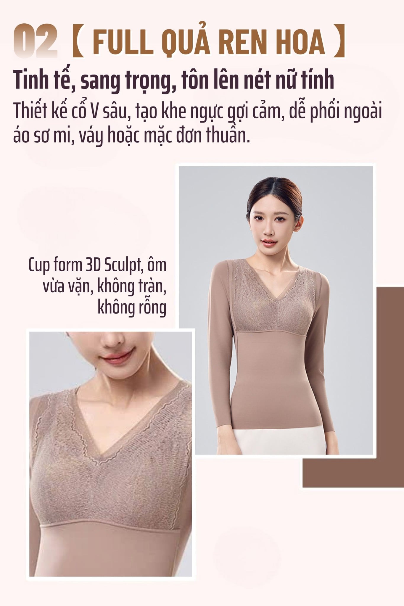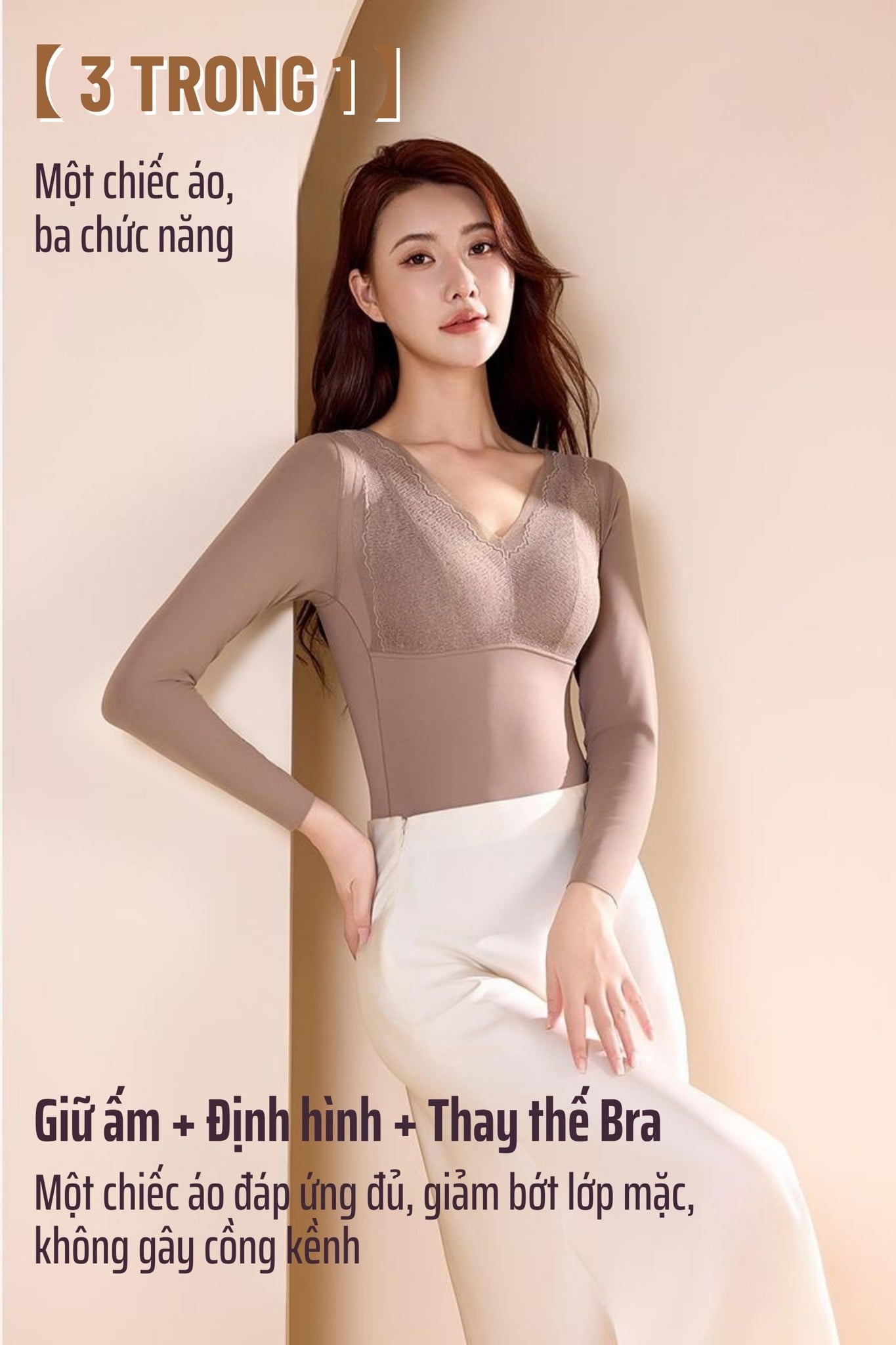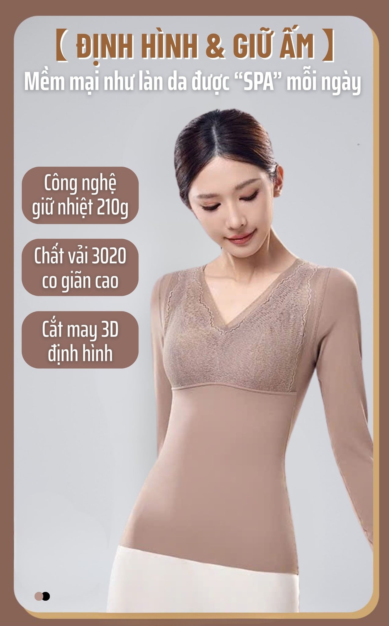A72 là áo định hình 3 trong 1: giữ ấm – định hình – thay thế áo ngực, giúp giảm bớt lớp mặc mà vẫn gọn gàng, thoải mái. Áo sử dụng công nghệ giữ nhiệt 210g với vải dệt không khí mềm nhẹ, giữ ấm ổn định. Cup 3D Sculpt tích hợp Bio-ceramic giúp nâng ngực tự nhiên, tiêu mỡ và giảm mệt mỏi khi mặc lâu. Chất liệu 3020 cao cấp co giãn 4 chiều, ôm sát cơ thể mà không bí nóng. Thiết kế cổ V ren hoa tinh tế, tay dài, bản lưng liền thân chống cuộn, tạo dáng thon gọn và nữ tính trong mọi outfit.
